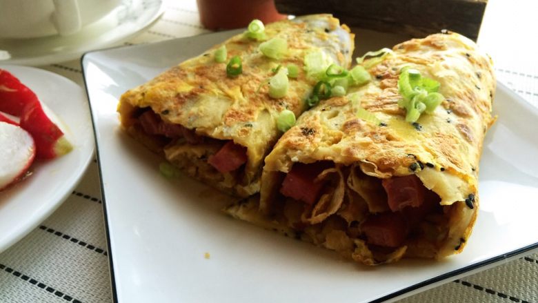 9. 反面煎,喜欢咸味的抹点黄豆酱,喜欢甜味的就抹番茄沙司,再撒上葱花、花生米、麻叶,卷好就可以出锅了