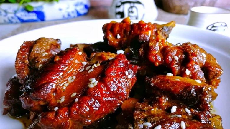 14. 收汤汁至浓稠,盛出。香气四溢的梅烧排骨就做好了。