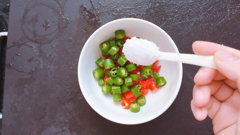 3. 青红米椒都切成圈,撒上约3g盐腌制一会