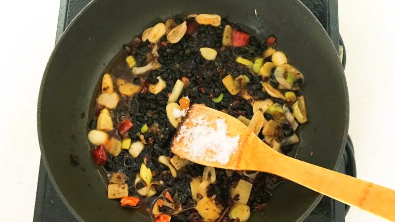 8. 加入花椒粒,加入大葱段,蒜片和姜片,翻炒出香味,加入豆豉