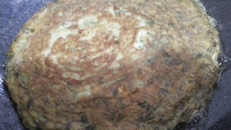 8. 一面煎好后,翻过来煎另一面,(我是将面蛋饼倒入盘里,然后再倒回锅里反面的哦!)