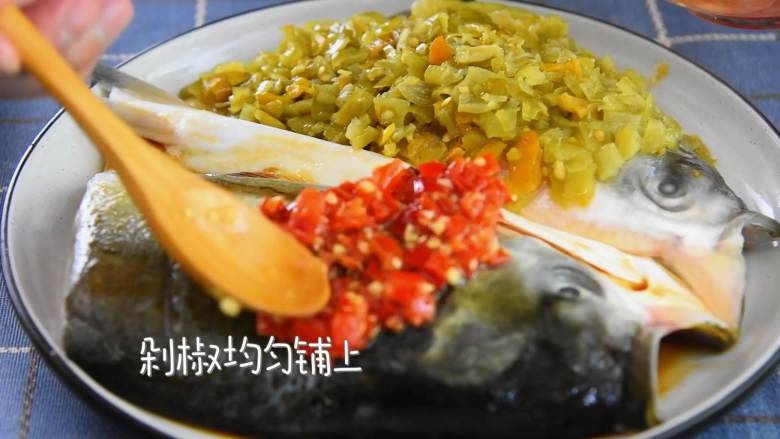 7. 剁椒均匀铺上。 大火蒸15分钟。