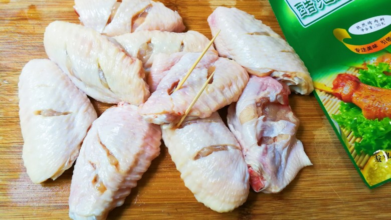 1. 鸡翅中正反两面划切两刀,用牙签扎一扎便于腌制入味,放入冰箱冷藏腌制五小时,微波炉烤正反两面一共八分钟,时间不能长,不要烤老了。