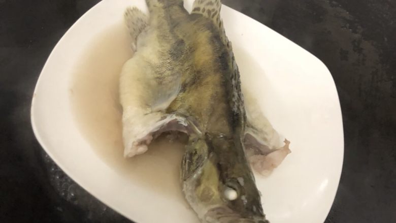 3. 蒸大概7-8分钟即可、看鱼大小、一斤左右的要10分钟左右、盘里出现多余的鱼汁请倒掉