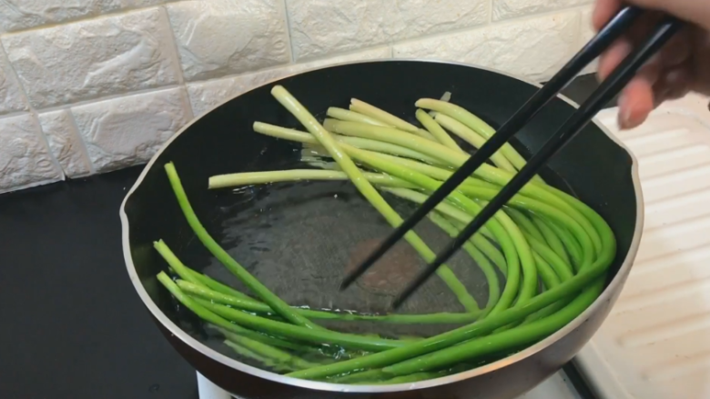 3. 放入蒜苔焯水 3到5分钟