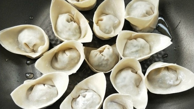 13. 平底锅不粘锅放少许油,把馄饨放入。 ~可以一次性放紧密一些。