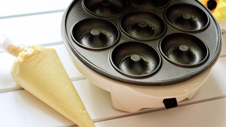 11. 把静止好的面糊倒入裱花袋里、把甜甜圈的机器提起预热后、用刷子蘸少许食用油抹匀模具