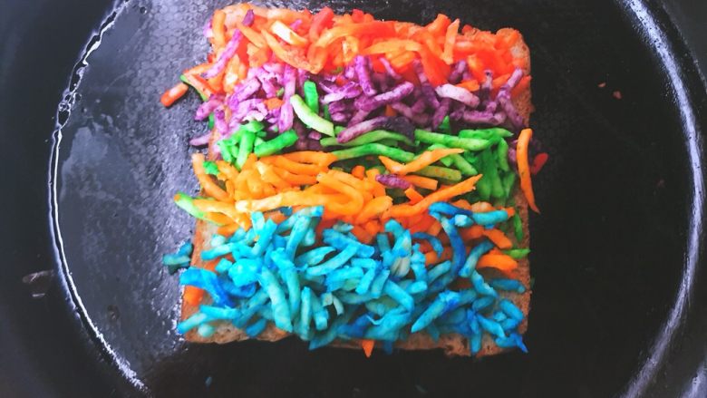 5. 将带有黄油的一面放在不粘锅内,摆好芝士(按颜色摆好)