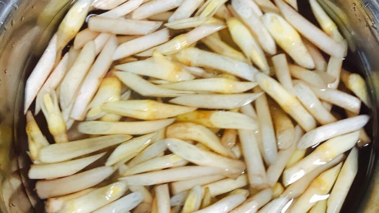 3. 油下锅烧热,放入姜蒜泡椒爆香,然后倒入藕带翻炒,放入少许醋