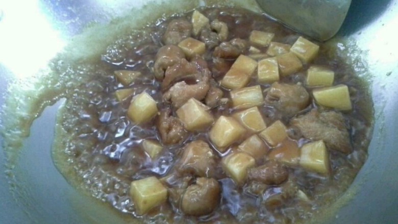 7. 倒入里脊肉、土豆大火煮5分钟加水淀粉勾芡后再放醋、盐炒匀