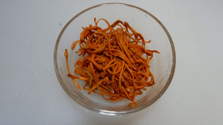 3. 茼蒿切成小段,虫草花用温水浸泡10分钟。