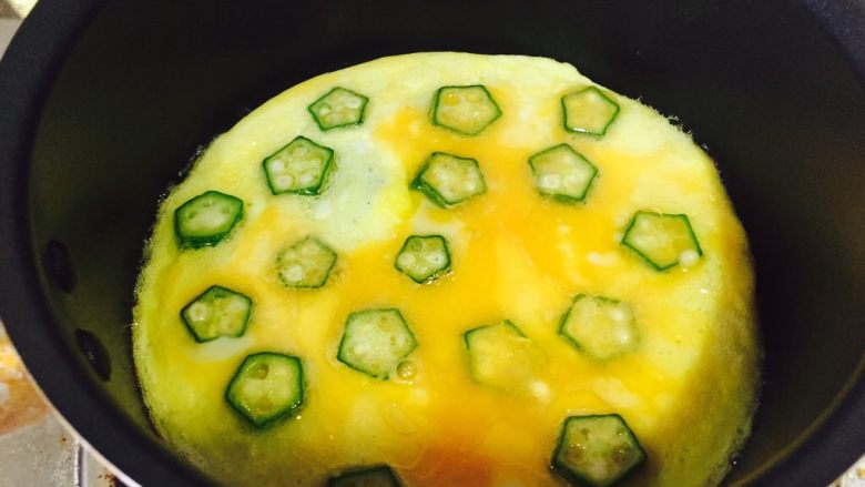 7. 蛋液稍微凝固后,一片片加入秋葵