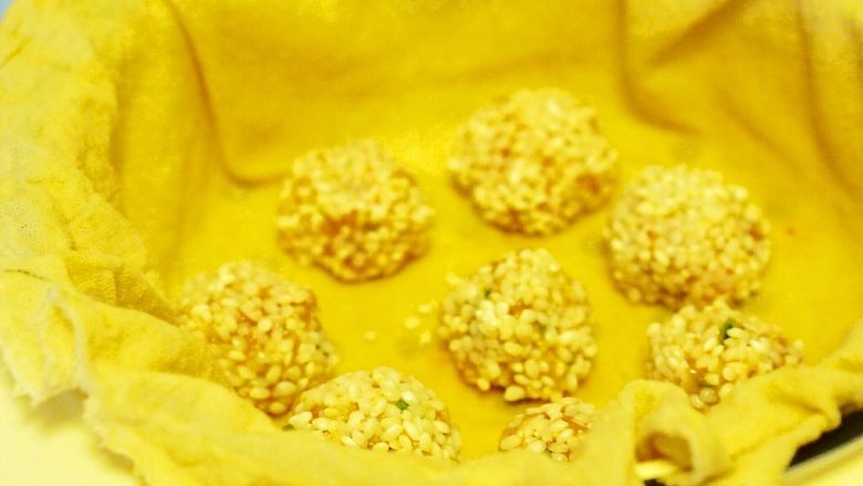 7. 新出炉的丸子,放上胡萝卜,跟葱花点缀 一般的糯米丸子到这里就结束了