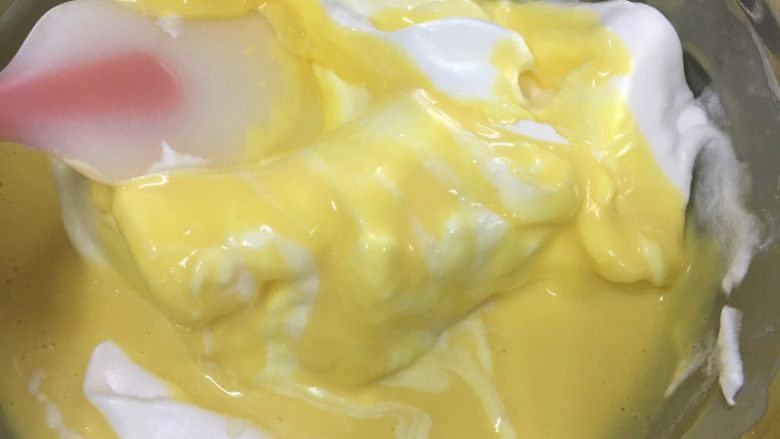 5. 蛋黄分2次加入奶糊中翻拌