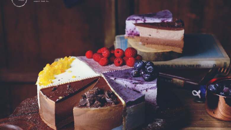 10. 慕斯液:把蓝莓酱,树莓酱,巧克力分别用容器装好,再各自加入100克牛奶中,(纯牛奶100*3就是用在这里的)