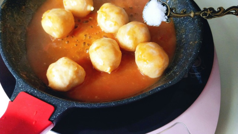 了不起的小番茄+茄汁三文鱼芝士丸,加入盐,收汤汁至浓稠即可出锅。