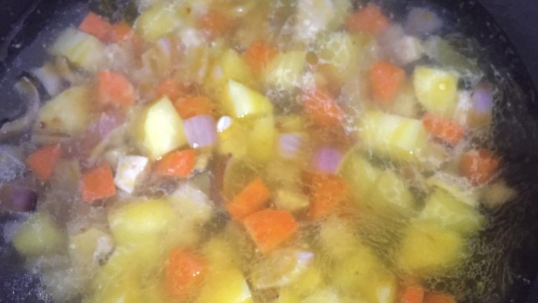 5. 然后关火,将咖哩块放入帮其搅拌融化,我准备的是两人份,放三小块咖喱合适,然后开小火煮个三分钟差不多,觉得稀了多煮一下,干了的话加点水就好啦