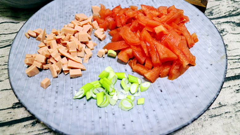 2. 番茄、葱花、火腿都切丁备用。