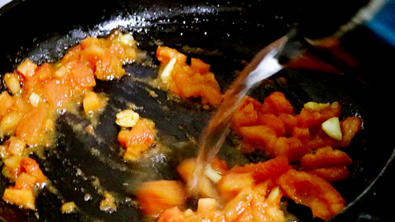5. 爆蒜香,倒入番茄丁翻炒炒一炒加水,加盐,加入没过番茄的水。