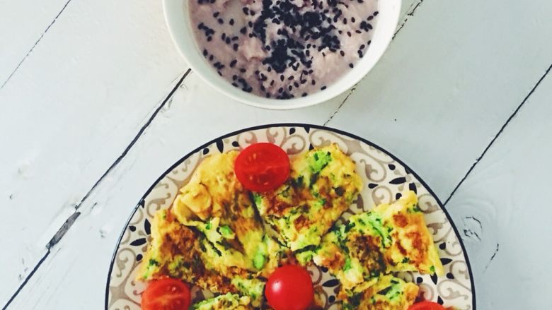 #熹宝的早餐日记# 2018年4月22日,小雨。 早安,朋友。 盖菜鸡蛋饼+全麦吐司+红豆花生汁为+黑芝麻豆渣+香蕉+牛奶 没想到豆渣撒上黑芝麻也非常美味呢[呲牙]
