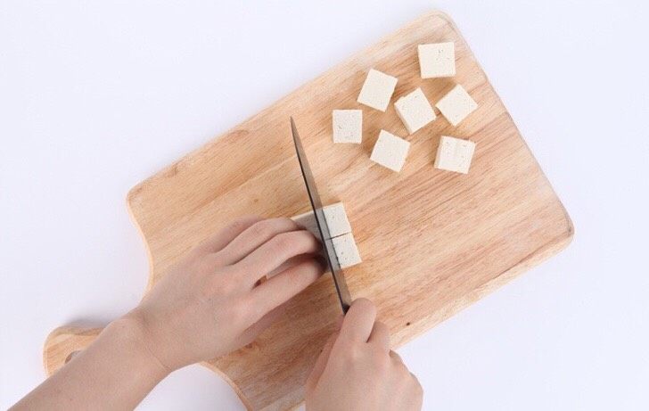 2. 豆腐下面铺上吸油纸,撒上少许的盐腌制片刻。