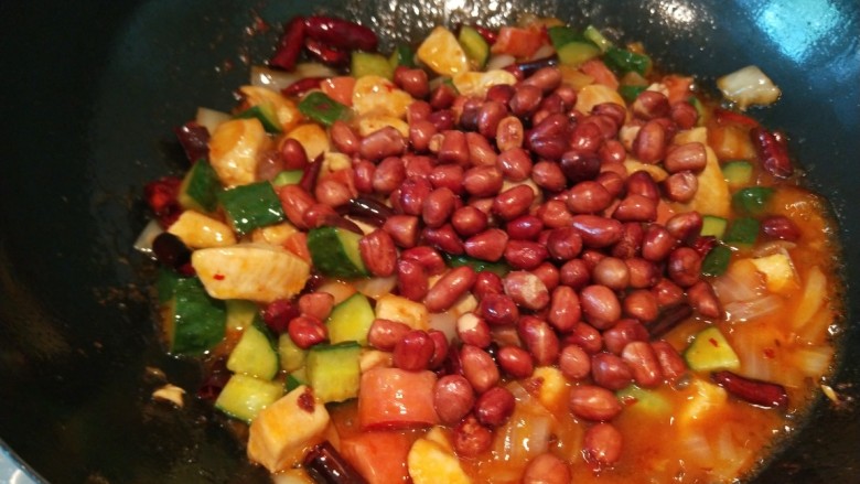 10. 锅中放适量油烧七成热,放入鸡丁过油,变白色马上捞出来控油。