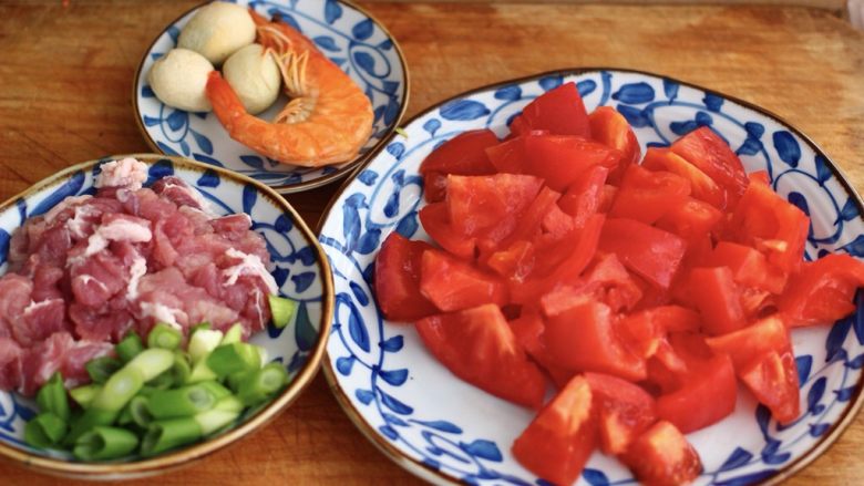 11. 番茄洗净后用刀切成块状、瘦猪肉也同样用刀切成薄片、鹌鹑蛋去皮、葱切成花