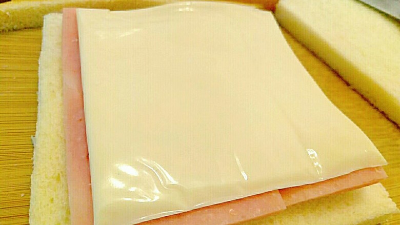 1. 第一小步一定要把土司的四边给切掉,不然会影响口感和外观! 接着将切好的土司片平放,依次铺上一片奶酪 、2片火腿