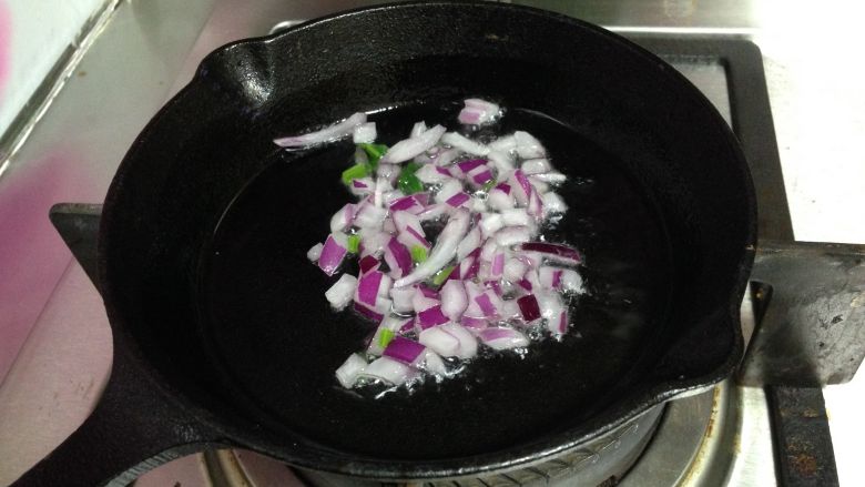 9. 热锅凉油下入洋葱碎炒出香味