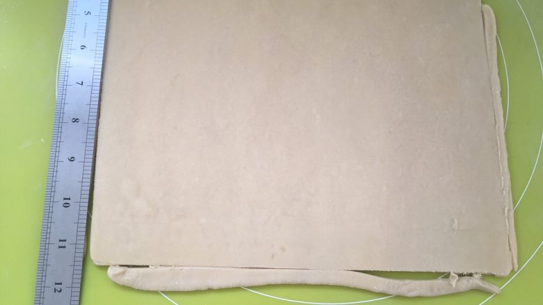 16. 撒点干粉,将冷藏好的面片擀成长方形,厚度约为0.3厘米左右