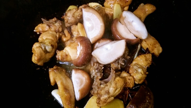10. 香菇下入锅肉翻炒几下之后,可以把火力转的稍小一些,让各种食材的味道相互融合一下。
