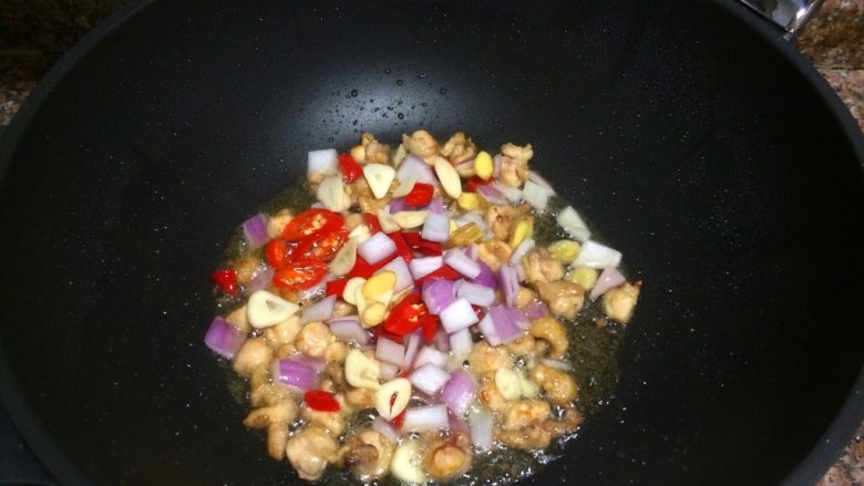 6. 放入鸡肉翻炒至表面微微发黄。