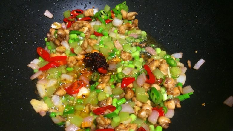 7. 放入大蒜、生姜、洋葱、泡椒翻炒出香味。