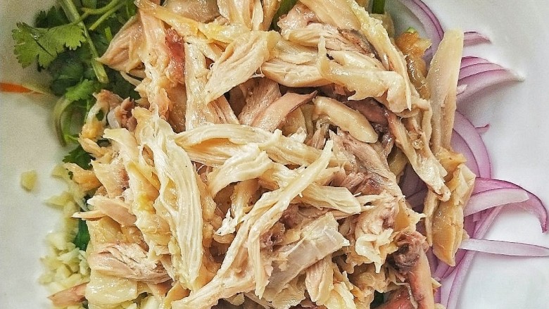 13. 放凉的手撕鸡撕成丝放入大碗中。