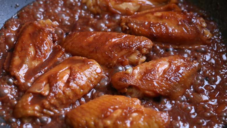 8. 翻炒均匀后,倒入调好的腐乳汁,加入白糖翻炒,使每个鸡翅都均匀裹上酱汁。