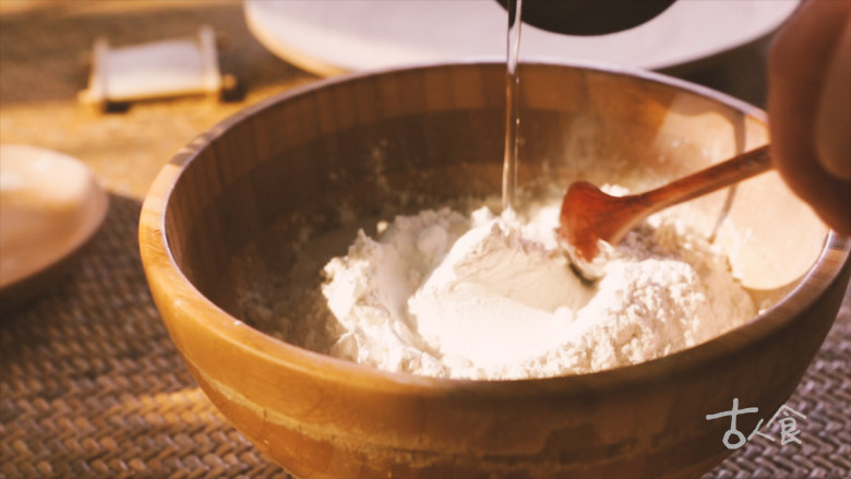 5. 将活好的面团拿出,放在撒有五白糕干粉的案板上开始揉;