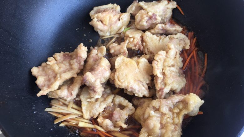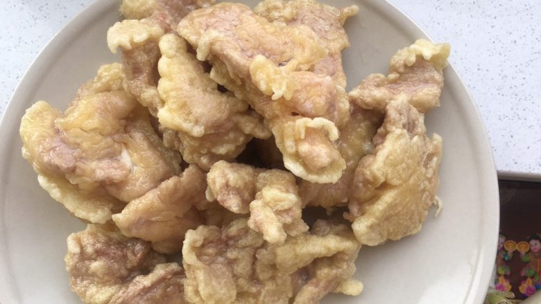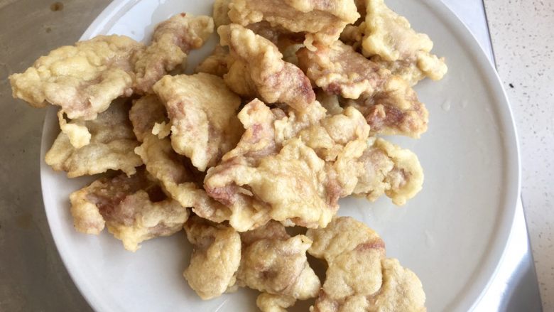 14. 一片一片放入挂好糊的里脊肉片