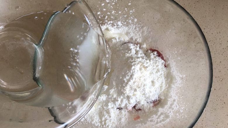 2. 肉放入小盆 加大量淀粉 加水