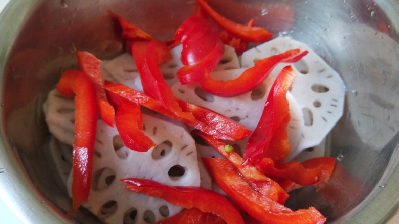 3. 莲藕切成片煮熟捞出来过凉水,在捞出来放入盆中。