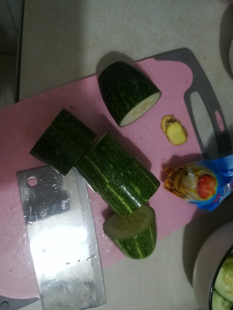 2. 胡瓜切大块,老的话要削皮、去籽。我比较懒,后悔了,记得老瓜要削皮削皮削皮