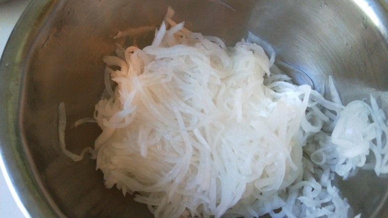 6. 白萝卜丝用手挤出水分。