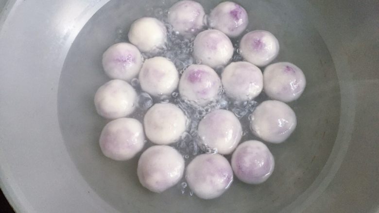 14. 煮至汤圆全部浮起并开始显色时,关火加盖焖5~8分钟,汤圆会越焖越通透显色