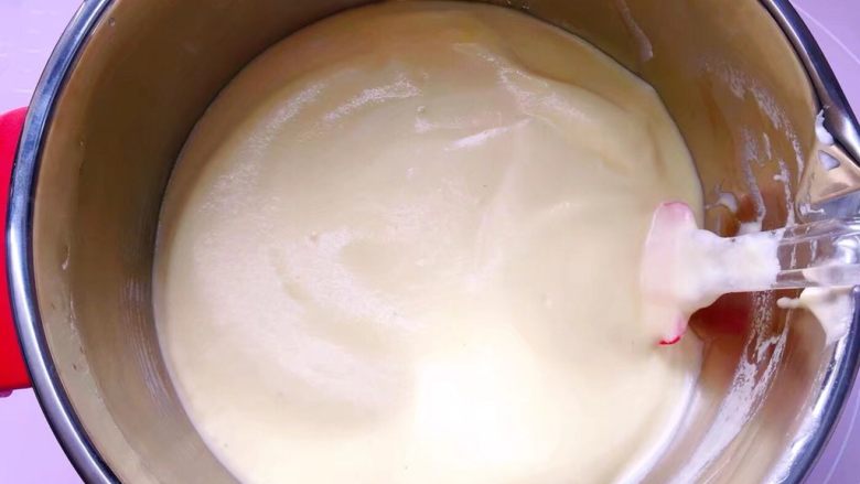 9. 翻拌均匀至无颗粒顺滑的状态后待用(蛋黄糊做好后,可以预热烤箱了,145度预热,具体的温度大家可以根据自己的烤箱适当上下调整)