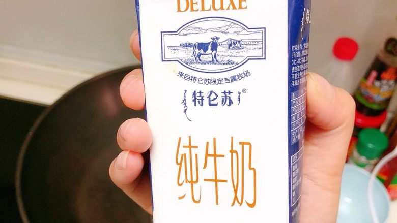 2. 锅中倒入一盒牛奶,我用的是特仑苏