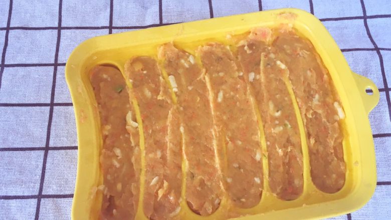 8. 将做好的鸡肉泥用勺子倒入裱花袋,在裱花袋的前端剪口,在模具里轻轻刷一层食用油(没有模具的可以用锡箔纸代替)