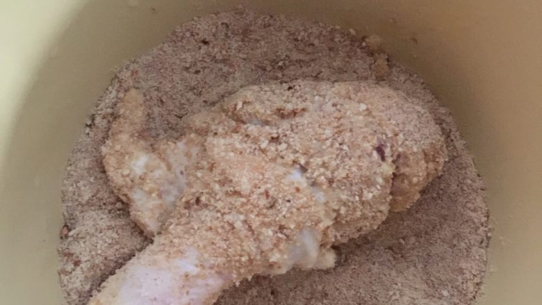 3. 将裹好面粉的鸡腿放入蛋液中浸泡