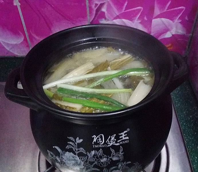 8. 将葱姜、鸭腿及腌菜梗一起放入砂锅中