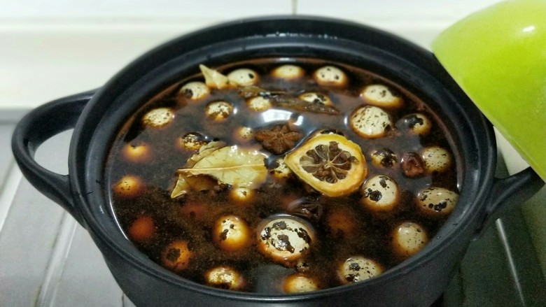 6. 把所有的调味食材倒入砂锅中,加入适量水,再把提前煮熟并压有裂痕么鹌鹑蛋放锅里,水没过鹌鹑蛋为佳。