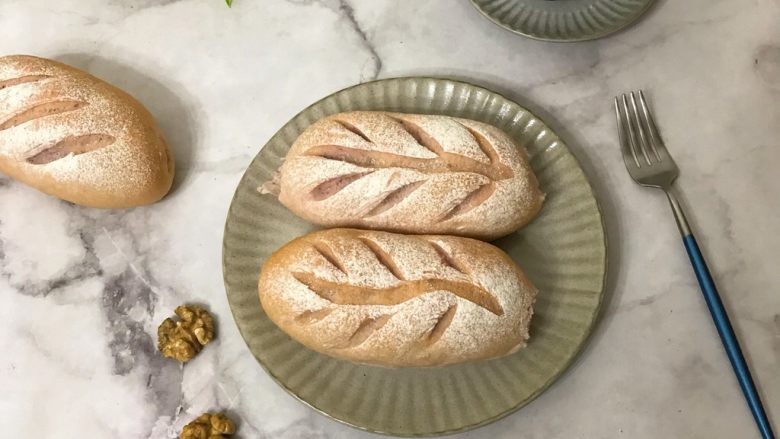 - 我是做了两盘分两次烤的,烤箱小的朋友可以减半做,注意面粉的吸水率,紫薯泥我是加水用食品料理机打的方子中有用水量,焦糖核桃请查看我的焦糖核桃食谱。