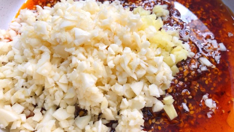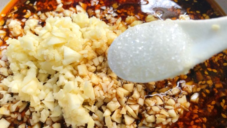 9. 接下来调酱汁,拿一个大一点的碗,倒入50g自制辣椒油